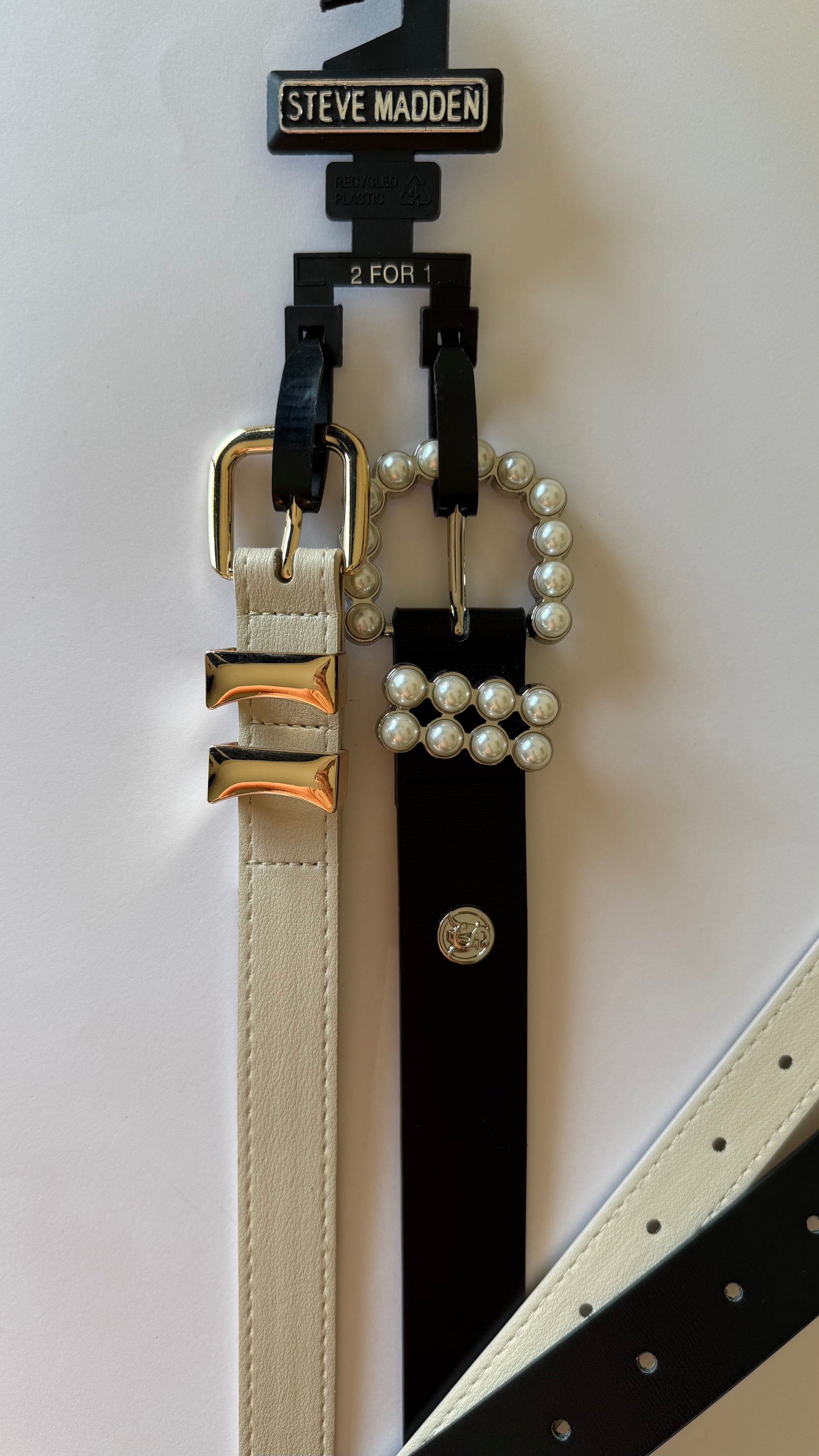 Steve Madden 2 for 1 women's belt. One cream belt with a gold buckle and one black belt with a pearl embellished buckle.
